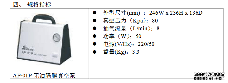 2.為了延伸電機(jī)的運(yùn)用壽命,AP-01P/01D真空泵規(guī)劃有過熱維護(hù)功用。為了確保真空泵正常作業(yè),無油真空泵接連作業(yè)時(shí)間應(yīng)盡量少于30分鐘。如果泵體過熱無法正常作業(yè),封閉電源開關(guān),待電機(jī)溫度降低后,再從頭發(fā)動(dòng)真空泵。
