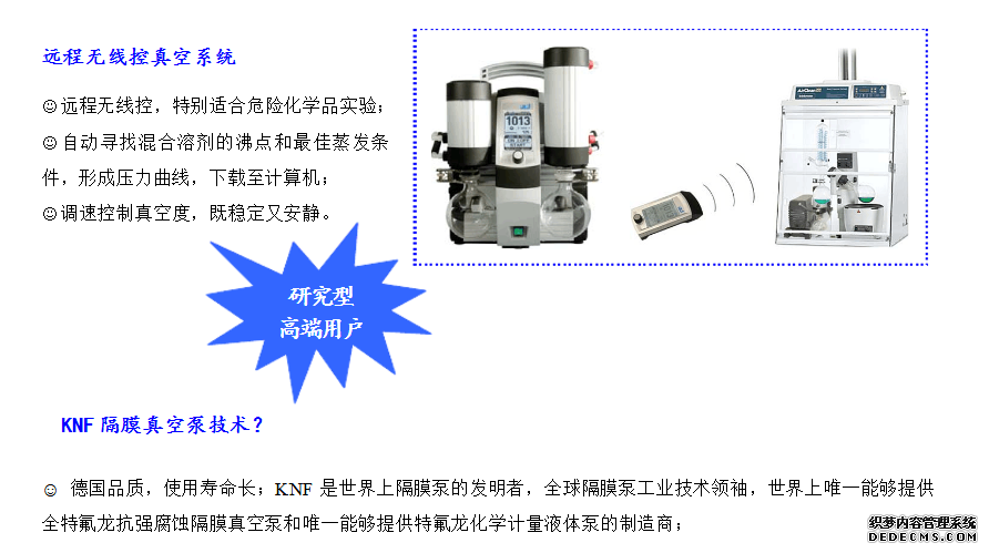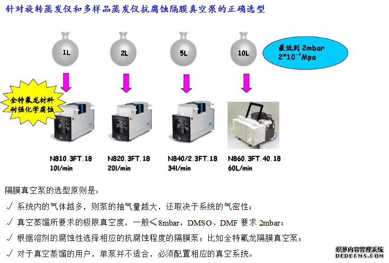 答:旋轉(zhuǎn)蒸發(fā)儀、多樣品蒸發(fā)儀需要配真空泵才能使用,一般以水循環(huán)真空泵和隔膜泵較常見(jiàn),而油泵較少見(jiàn)。隔膜泵比水循環(huán)真空泵可達(dá)到更高的真空度,因此水循環(huán)真空泵在蒸餾高沸點(diǎn)溶劑時(shí)很慢,如有機(jī)實(shí)驗(yàn)室常用的DMSO。KNF全特氟龍隔膜真空泵抗強(qiáng)化學(xué)腐蝕,如HCl、HNO3、HF、甲苯、氯仿等所有化學(xué)物,且能完全回收,不會(huì)飄散出去污染環(huán)境和影響健康。在歐盟G家出于對(duì)環(huán)境保護(hù)的考慮,已禁止使用水循環(huán)真空泵;而在日本則立法強(qiáng)制要求廢水處理達(dá)標(biāo)后才能排放。因此樣品內(nèi)含有機(jī)溶劑,建議用隔膜泵較好。