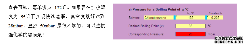 問(wèn)2、在做滌綸中偶氮分析時(shí),用旋轉(zhuǎn)蒸發(fā)儀蒸發(fā)氯苯、二甲苯溶劑。按方法上說(shuō),在45~60℃旋蒸,我設(shè)在55℃,真空度50mbar,蒸不出來(lái)是怎么回事?